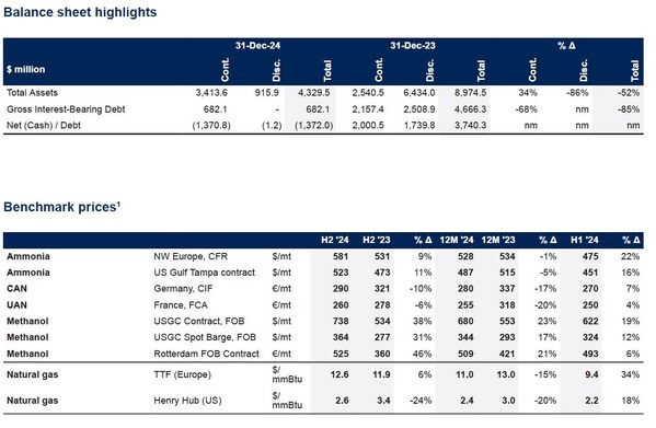 FY 2024 adjusted EBITDA for European Nitrogen (OCI's sole operating segment within Continuing Operations today) was $55 million compared to an adjusted EBITDA loss of $51 million in FY 2023. Earnings benefited from an improvement in volumes and lower average natural gas prices in 2024 compared to 2023 despite an increase in gas pricing in H2 2024.