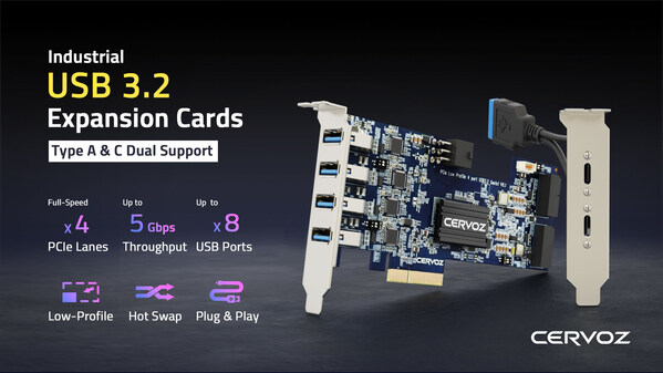 Cervoz’s Industrial USB 3.2 Expansion Cards: Designed for high-performance industrial applications,the MEC-USB-PL series offers up to 8 USB ports with dual Type-A and Type-C support,5 Gbps throughput,and features like hot swap and plug-and-play functionality in a low-profile form factor.