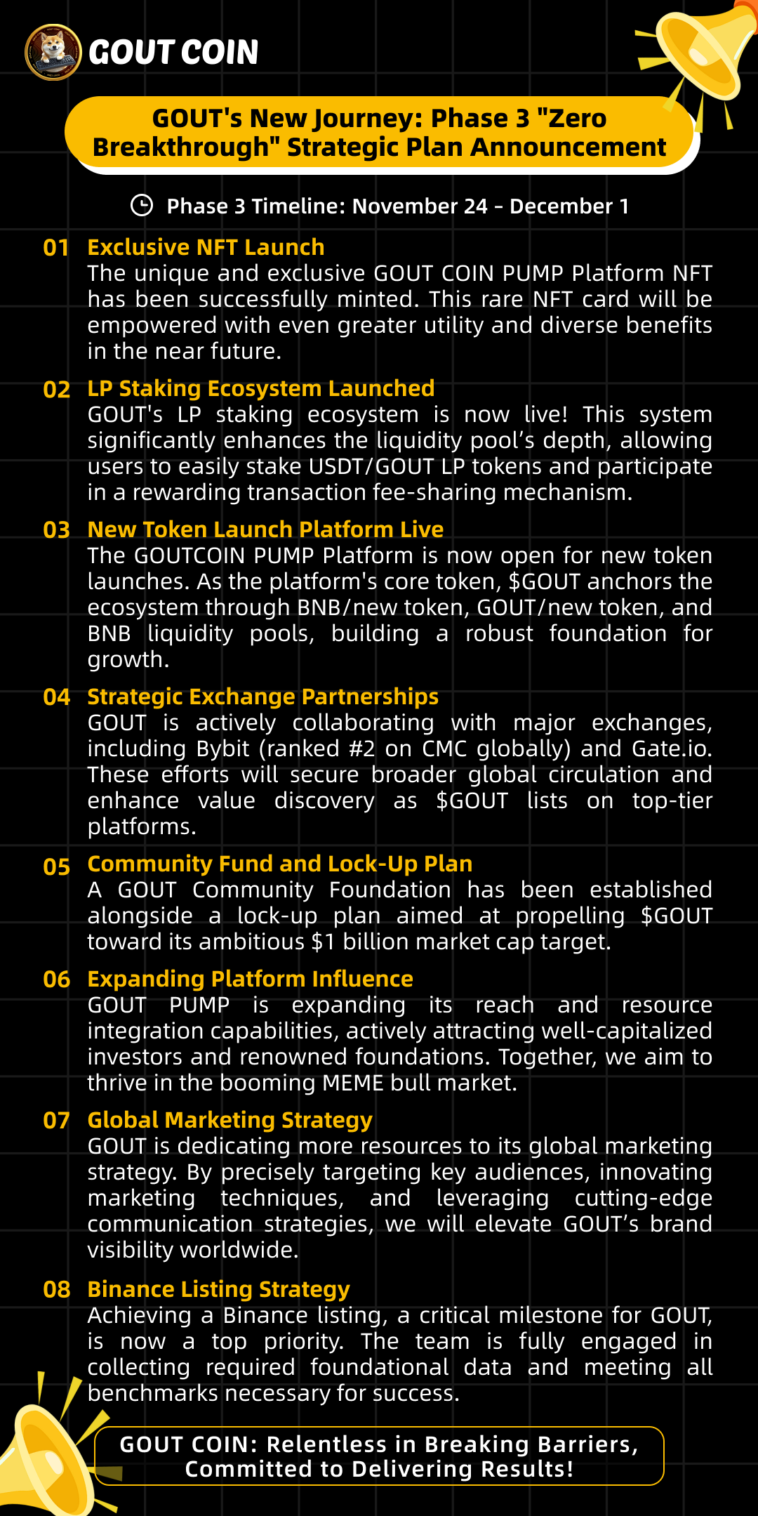 The team unveiled the core strategy behind its ambitious 30-day growth plan. From its innovative PUMP Launchpad to liquidity management and global promotions, all efforts are directed toward maximizing token value. The PUMP platform, as a central pillar of the GOUT ecosystem, employs a multi-pool deflationary burn model, injecting high potential for sustainable growth.