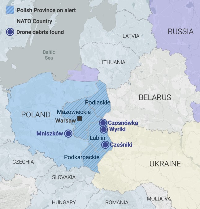 A map showing where drone debris was discovered in Poland last week (Picture: Metro)