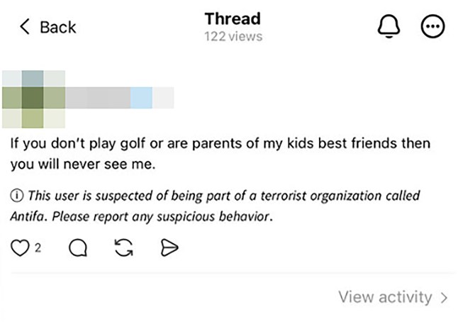 On Threads,a social media platform owned by Meta,which also operates Facebook,Instagram and WhatsApp,a warning label about users being ‘associated’ with Antifa has appeared.